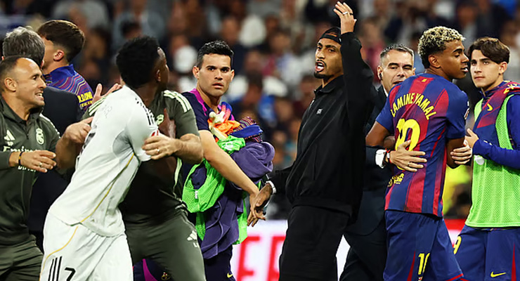 এতেই শেষ নয়। দুই দলের খেলোয়াড়দের মধ্যে হাতাহাতি শুরু হয়। মাঠে বিশৃঙ্খলা তৈরি হয়, রেফারিদের হস্তক্ষেপে পরিস্থিতি কিছুটা নিয়ন্ত্রণে আসে। তবু ভিনিসিয়ুসকে দেখা যায় আক্রমণাত্মক ভঙ্গিতে ইয়ামালের দিকে কিছু বলতে। ঘটনাস্থলে উপস্থিত সূত্রের দাবি, তিনি নাকি বলেছিলেন, “তুমি ব্যাকপাস ছাড়া কিছুই করনি!”