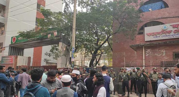সকাল দশটার পর থেকে সোহরাওয়ার্দী মেডিকেল কলেজ হাসপাতালের মর্গ এলাকা ঘুরে দেখা যায়, সেখানে নিরাপত্তা ব্যবস্থা জোরদার করা হয়েছে। আনসার, পুলিশ, বিজিবি ও সেনাবাহিনীর সদস্যদের উপস্থিতিতে পুরো এলাকা কঠোর নজরদারিতে রাখা হয়। হাসপাতাল চত্বর ও আশপাশের এলাকায় সাধারণ মানুষের ভিড়ও লক্ষ্য করা গেছে। আইনশৃঙ্খলা পরিস্থিতি স্বাভাবিক রাখতে বিভিন্ন সংস্থার সমন্বয়ে এই নিরাপত্তা ব্যবস্থা গ্রহণ করা হয়েছে।
