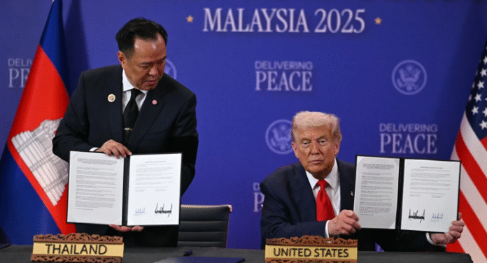 রবিবার এশিয়া সফরের শুরুতে মার্কিন প্রেসিডেন্ট উপস্থিত থেকে “কুয়ালালামপুর শান্তি চুক্তি” স্বাক্ষরের আনুষ্ঠানিকতা সম্পন্ন করেন। থাইল্যান্ড, কাম্বোডিয়া ও মালয়েশিয়ার নেতারা একসাথে উপস্থিত ছিলেন অনুষ্ঠানে, যার মূল বার্তা ছিল “Delivering Peace” — অর্থাৎ শান্তি প্রতিষ্ঠার অঙ্গীকার।