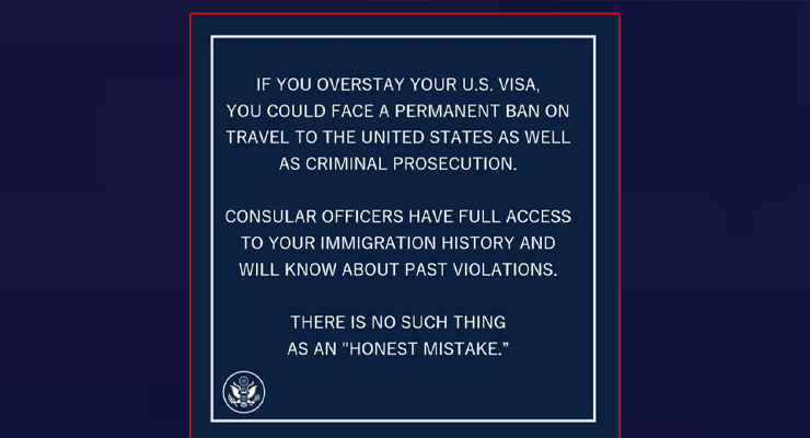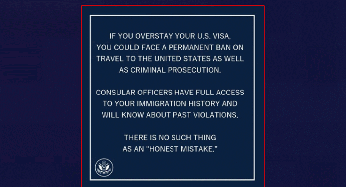 যুক্তরাষ্ট্রে ভিসার মেয়াদ শেষ হওয়ার পরেও যদি কেউ সেদেশে অবস্থান করেন, তাহলে ভবিষ্যতে ভ্রমণের ওপর স্থায়ী নিষেধাজ্ঞা পেতে পারেন। ঢাকার মার্কিন দূতাবাস সম্প্রতি তাদের ফেসবুক পেজে এক সতর্কতামূলক বার্তায় এ তথ্য জানিয়েছে।