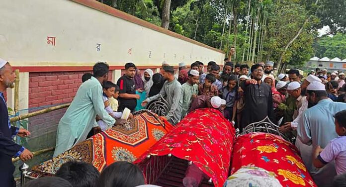 রোববার সকালে কানুটিয়া স্কুল মাঠে জানাজা শেষে ওমেদপুর গোরস্থানে পাশাপাশি কবরেই দাফন করা হয় শিশু তিনটিকে। নিহতরা হলো—চাপাতলা গ্রামের তরিকুল বিশ্বাসের মেয়ে তানহা ইসলাম তরী (৯), সাজ্জাদ মল্লিকের মেয়ে সামিয়া আক্তার সিনথিয়া (৯) এবং আনারুল ইসলামের মেয়ে তারিন ইসলাম (৮)। তানহা ও সামিয়ার পরিবারে আত্মীয়তা রয়েছে, আর তারিন তাঁদের প্রতিবেশী। তিনজনই স্থানীয় তিনটি পৃথক শিক্ষাপ্রতিষ্ঠানে নার্সারি, প্রথম ও তৃতীয় শ্রেণিতে পড়ত। প্রত্যেকেই ছিল নিজ নিজ পরিবারের বড় সন্তান।