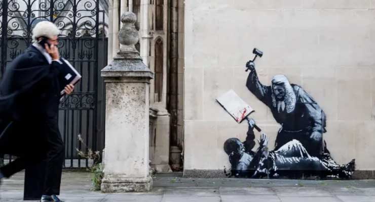 লন্ডনের কেন্দ্রস্থলে অবস্থিত রয়্যাল কোর্ট অব জাস্টিসের দেয়ালে রহস্যময় স্ট্রিট আর্টিস্ট ব্যাঙ্কসির নতুন একটি মূরাল প্রকাশিত হয়েছে। এই শিল্পকর্মে দেখা যায় একটি বিচারককে, যিনি ঐতিহ্যবাহী উইগ ও কালো রোবে আচ্ছাদিত, একটি প্রতিবাদকারীর ওপর আঘাত করাচ্ছেন। ঘুমিয়ে থাকা প্রতিবাদকারীর হাতে থাকা প্লাকার্ডে রক্তের ছিটে ছড়াচ্ছে।